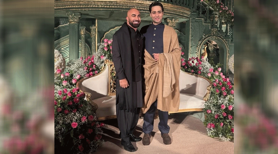 جنید صفدر نے مہندی کی تقریب میں روایتی گہرے نیلے رنگ کا کرتہ پہنا۔ کرتے پر سنہری بٹن اور سادہ کٹ نے ایک شاہی تاثر دیا، اور لباس کے ساتھ روایتی انداز میں ایک سنہری، بھوری رنگ کی شال کندھوں پر لپٹی ہوئی تھی۔